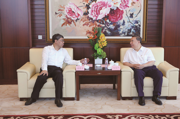 7月5日,中国建筑材料集团有限公司(简称中国建材)董事长宋志平一行访问北京金隅,党委书记、董事长姜德义,总经理曾劲等领导在北京环球贸易中心公司总部与宋志平一行就进一步加强双方合作、助推水泥等建材行业持续健康发展进行了亲切会谈。